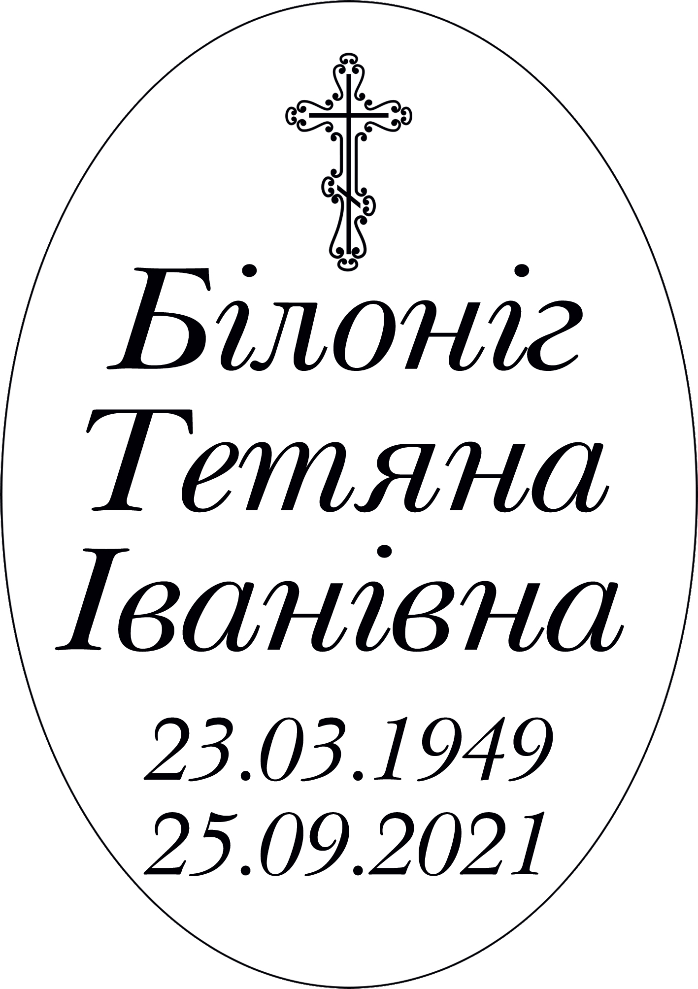 Ритуальний овал Ч/Б з текстом на хрест, пам’ятник. Кераміка із запіканням. Гарантія на стійкість до вигоряння 30 років