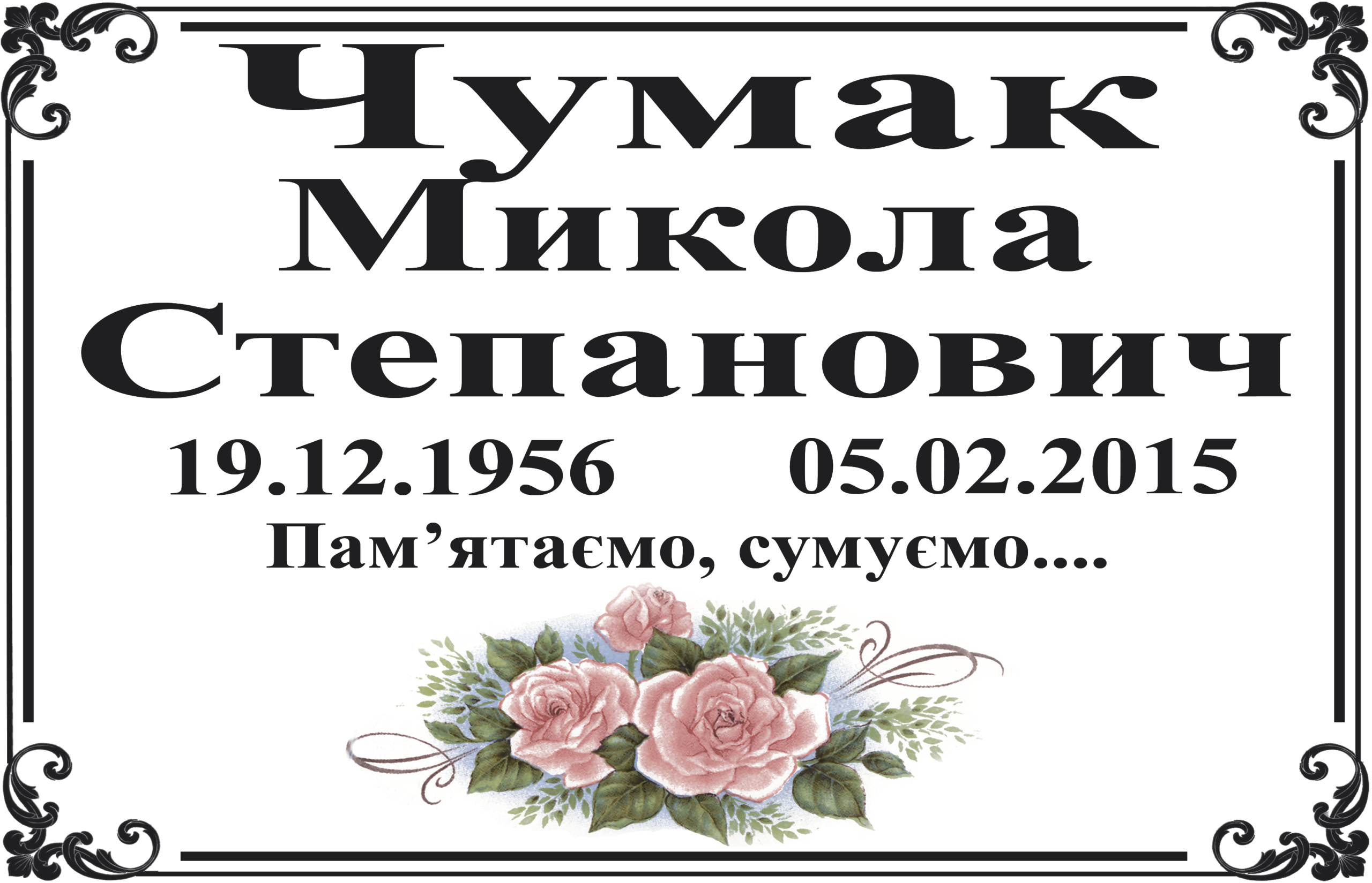 Ритуальна табличка Ч/Б з написом та кол. деколью. Кераміка із запіканням. Гарантія на стійкість до вигоряння 30 років.